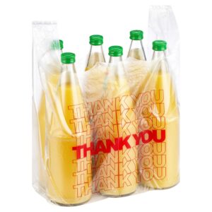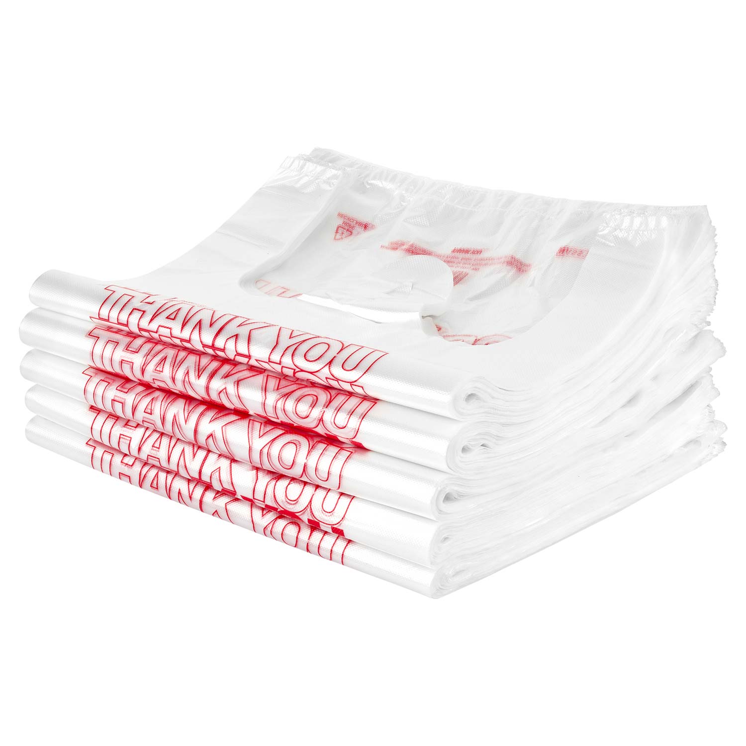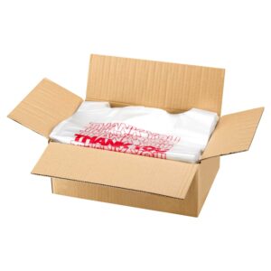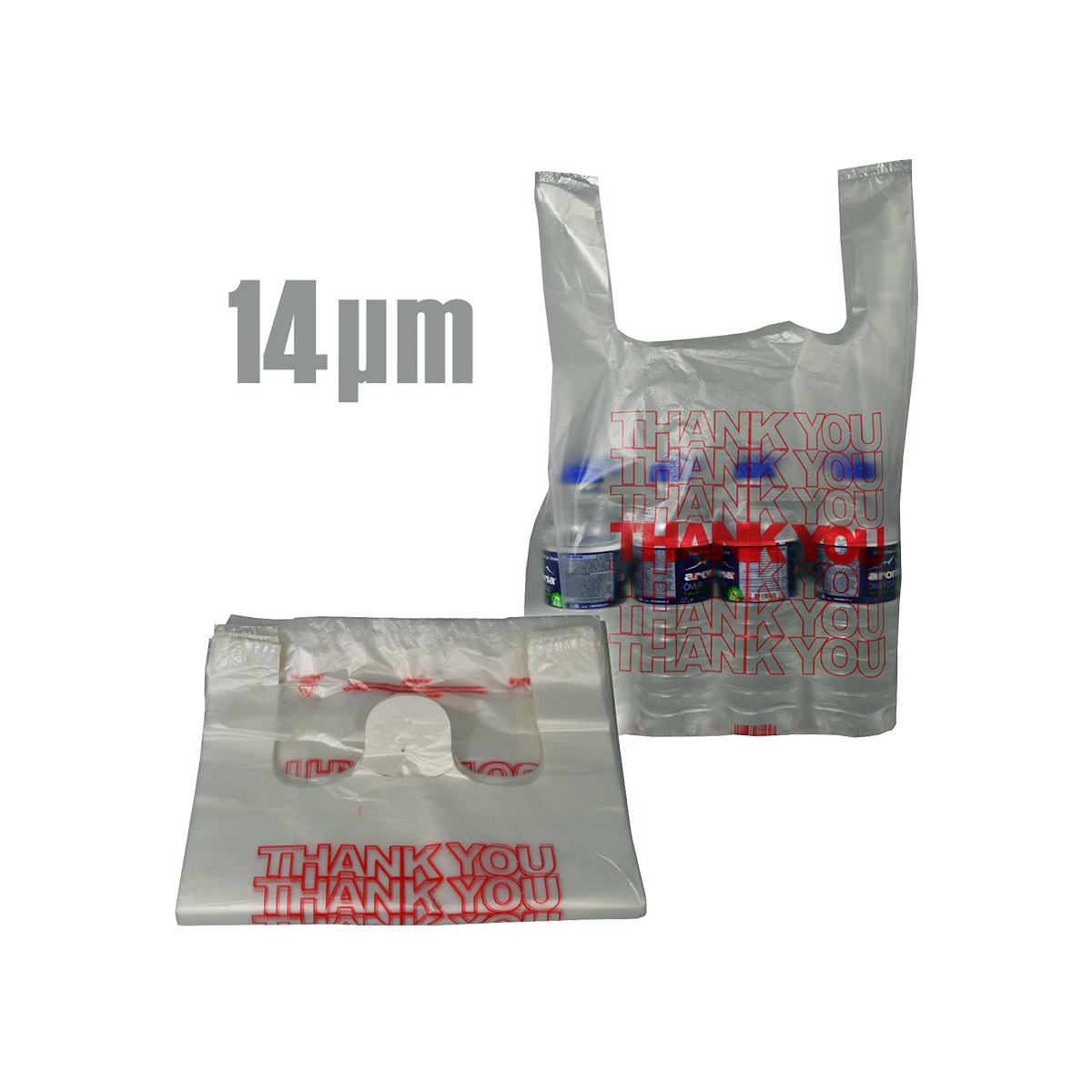 Weiße Tüte aus Plastik mit Tragegriff. Auf der Tüte selber ist ein neutrales Thank you in rot abgedruckt. Material: HDPE, Materialstärke 14my.