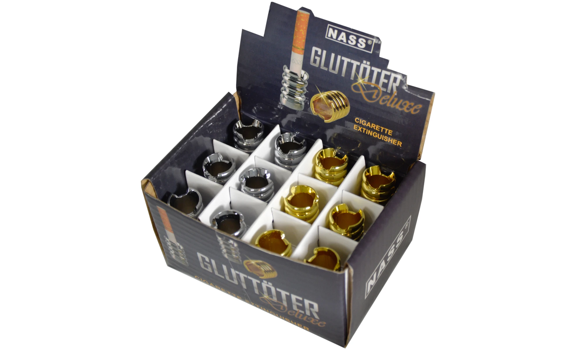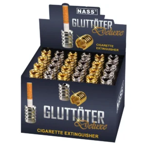 Die Glut der Zigarette erlischt durch das Hineinstecken in den Gluttöter aufgrund Sauerstoffmangels. Es entsteht kein Qualm oder Gestank. Geliefert wird im 24er Display in Mix-Farben: 12x Silber und 12x Gold.