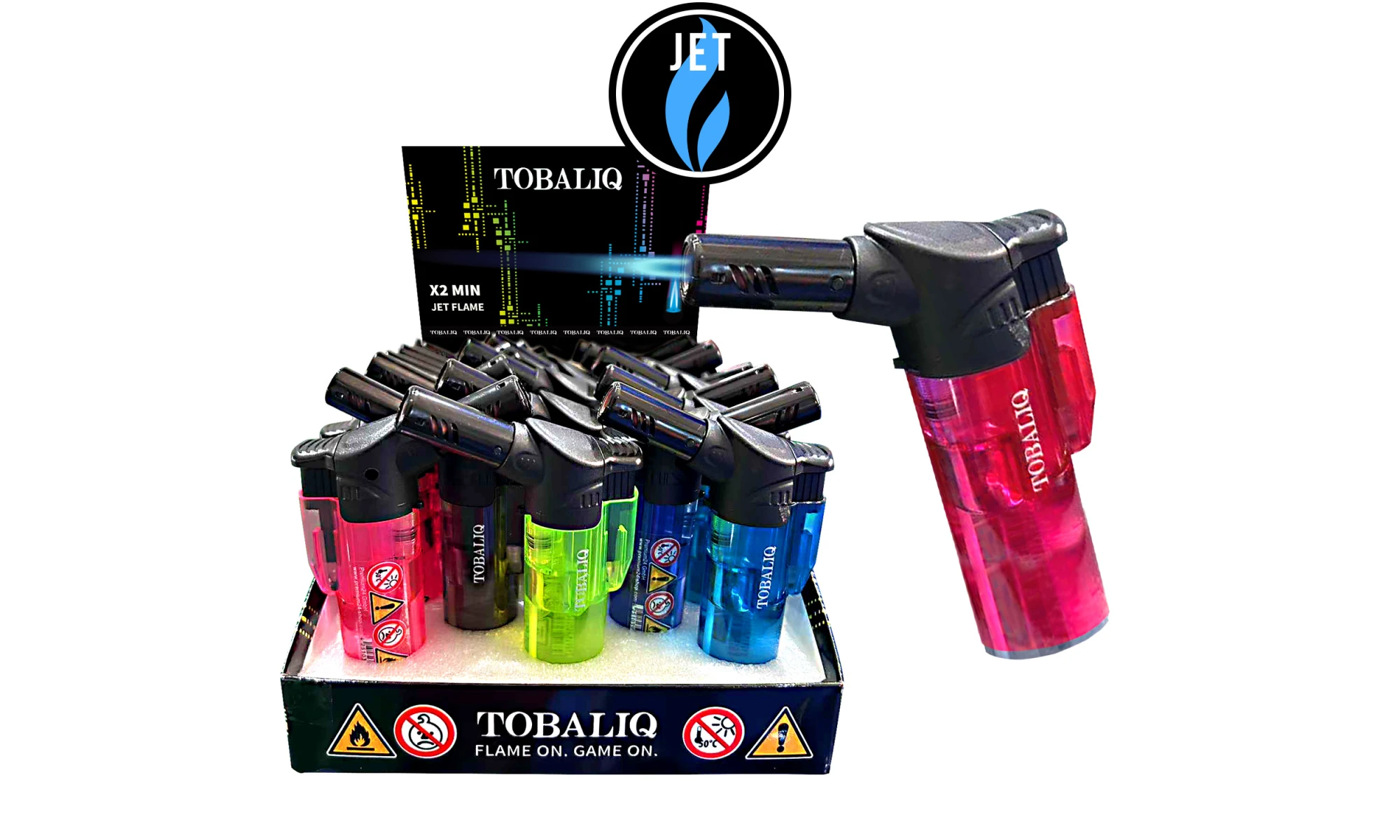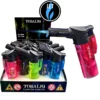 Großes, transparentes Jet Brenner mit Standfuß und Laserflamme. In den Farben blau, hell blau, rosa und schwarz im 25er Display sortiert.