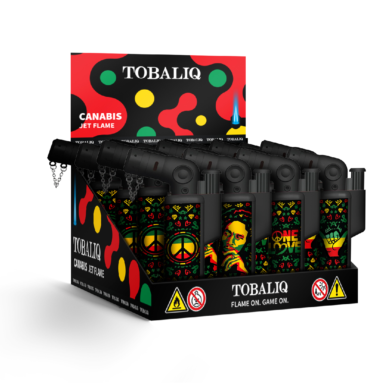 Stylisches Jet-Flame-Feuerzeug im eleganten UV-Cannabis-Design mit Schutzkappe, die per Sicherungskette befestigt ist. Ausgestattet mit einer kraftvollen, windresistenten Flamme, ist es nachfüllbar, langlebig und für den täglichen Gebrauch geeignet. Erhältlich in vier verschiedenen Rasta-Motiven und geliefert im praktischen 12er-Display – ideal für den Eigenbedarf, als Geschenk oder für den Weiterverkauf.